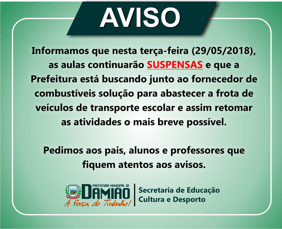 Informamos que nesta terça-feira (29/05/2018), as aulas continuarão SUSPENSAS e que a Prefeitura está buscando junto ao fornecedor de combustíveis solução para abastecer a frota de veículos de transporte escolar e assim retomar as atividades o mais breve possível.