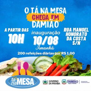 O programa "Tá na mesa" neste dia 10 de agosto de 2022 chega no município de Damião-PB. O referido programa destribuirá pelo valor simbólico de 1 real 200 refeições diárias. O restaurante cadastrado está localizado à rua Manoel Honorato da Costa, centro, a partir das 10h30 da manhã.