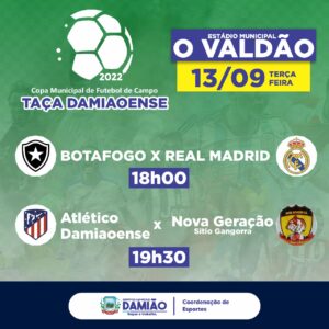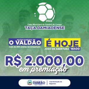 A Prefeitura Municipal tem o prazer de convidar toda a população damiaoense para prestigiar a Copa Municipal de Futebol de Campo. No último domingo aconteceu a abertura e nesta terça-feira acontecerão os primeiros jogos, a partir das 18:00h no estádio municipal "O Valdão".